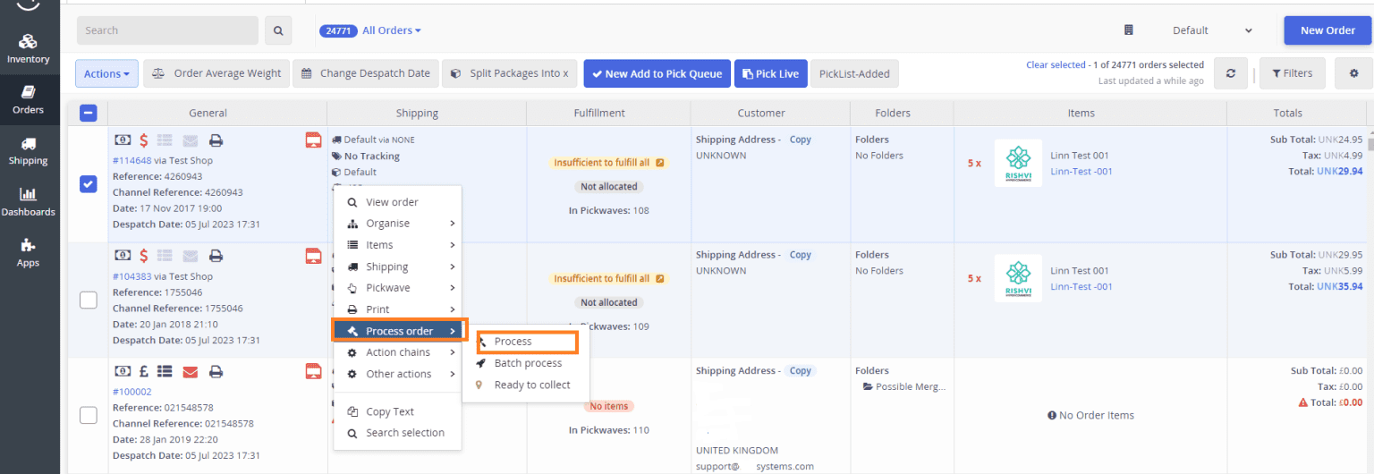 - Select the order, click Action, or right-click the order and go to Process Order > Process.