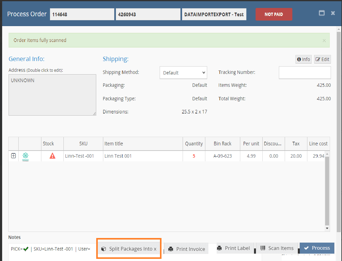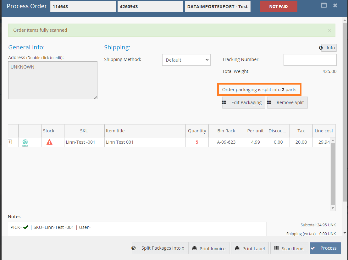 Step 2 : The Process Order screen will open. At the bottom of the screen, you will see the Split Into x Packages button.