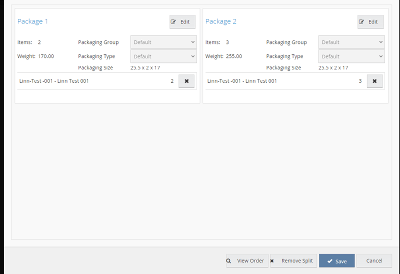 Step 7: When clicking the Edit Packaging button, the Split Packaging screen will open, allowing you to manually change the number of packages and move items between them.