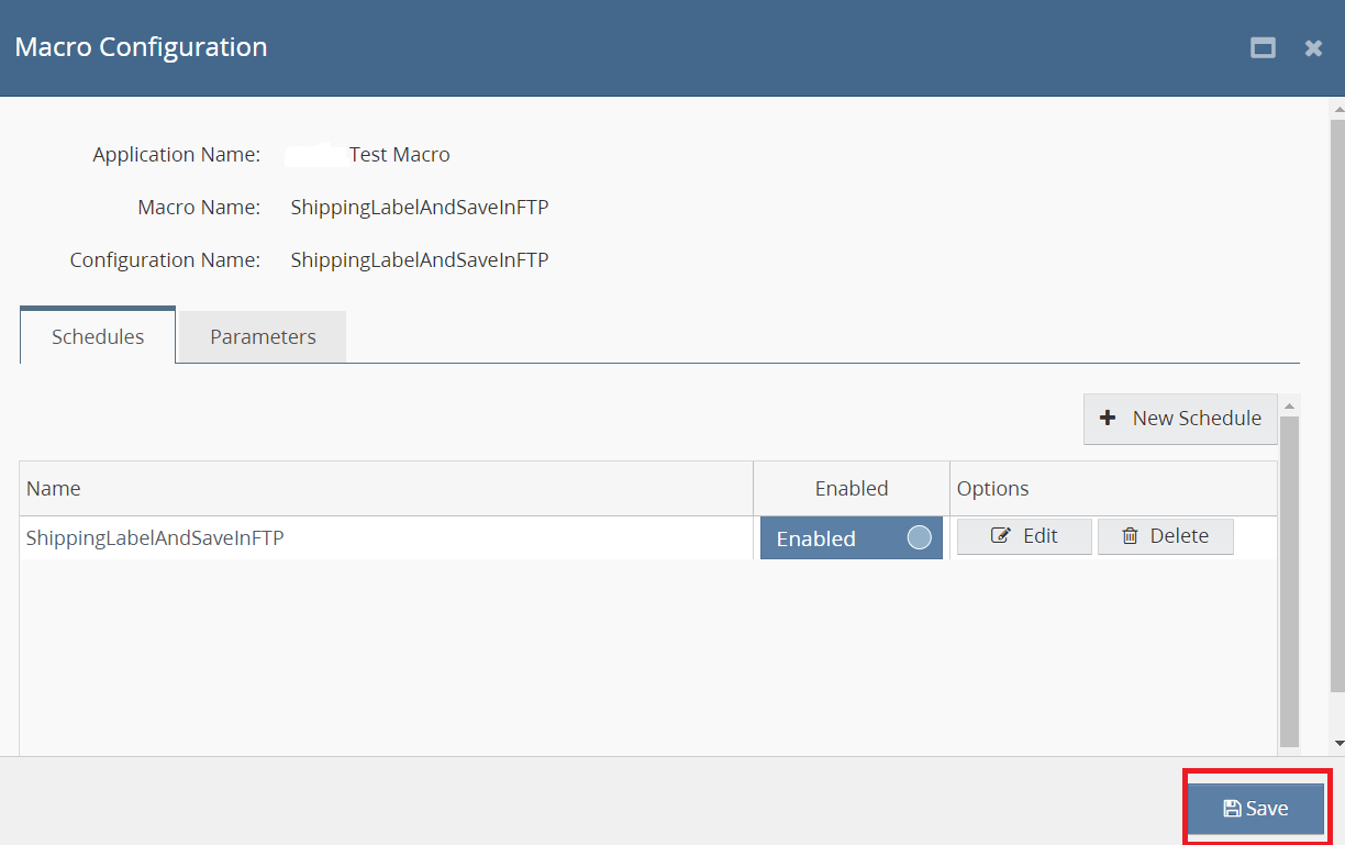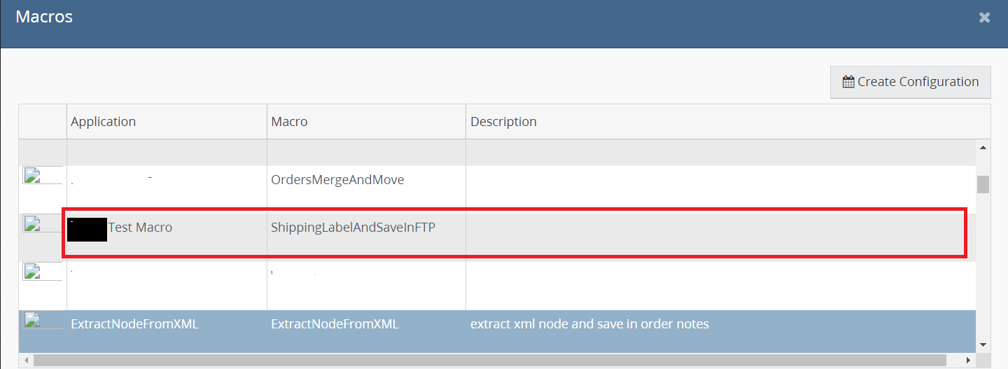 Step 2 : Select the ShippingLabelAndSaveInFTP macro and click Create Configuration.